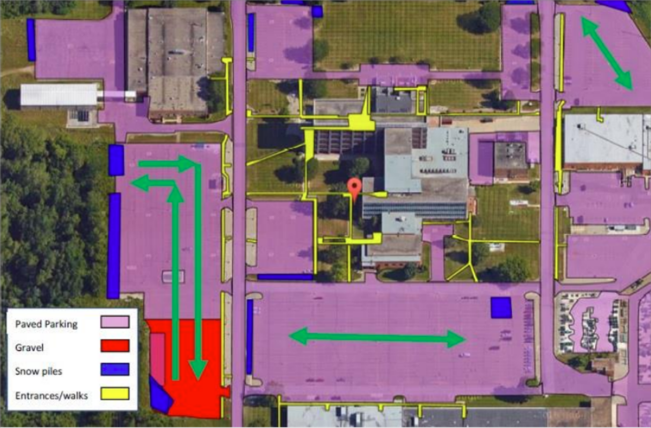 A customized site map is then designed specifically for your business. This detailed plan marks designated areas for plowing, graveling, and de-icing, ensuring precise application. Anti-icing and de-icing surfaces are measured for accurate treatment, snow movement is strategically planned, and pedestrian pathways are highlighted to maintain safe access.
